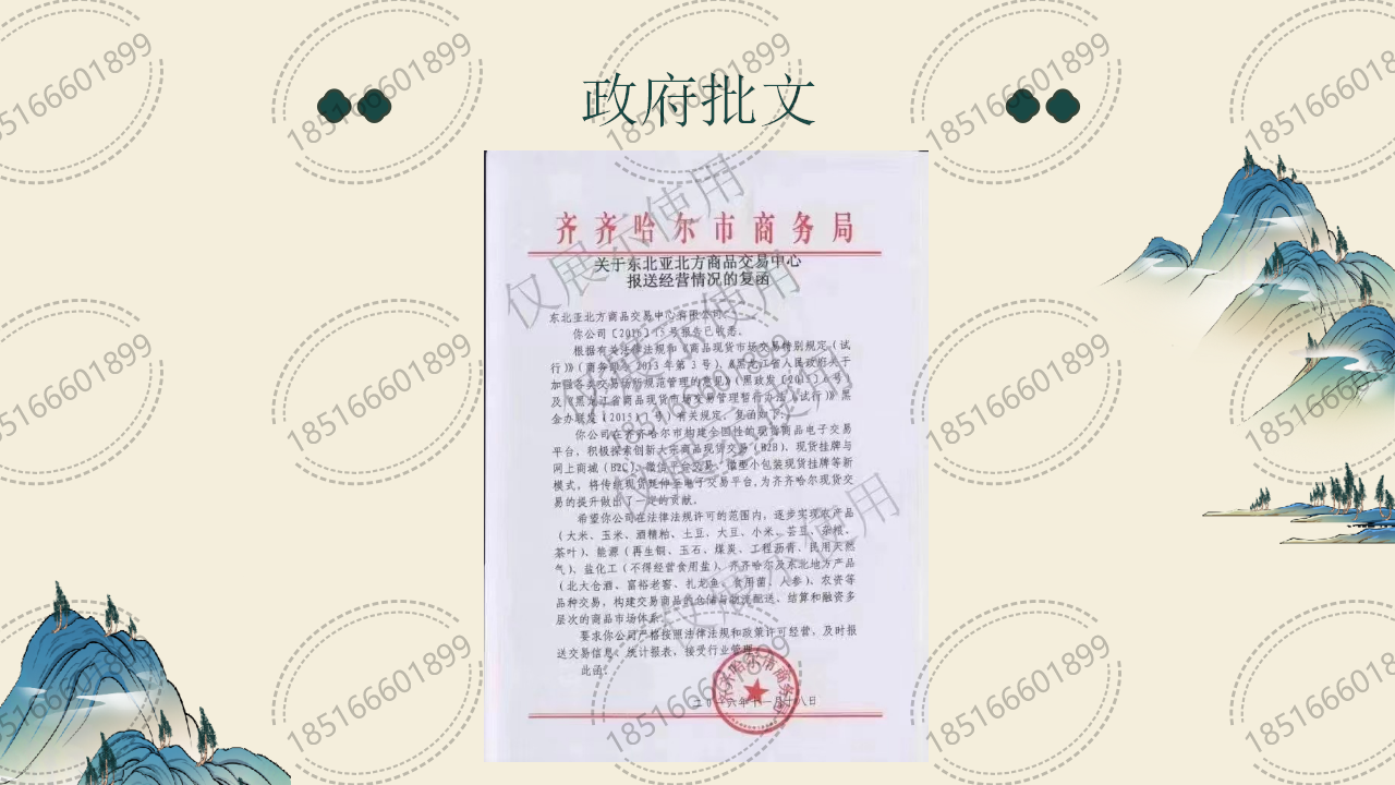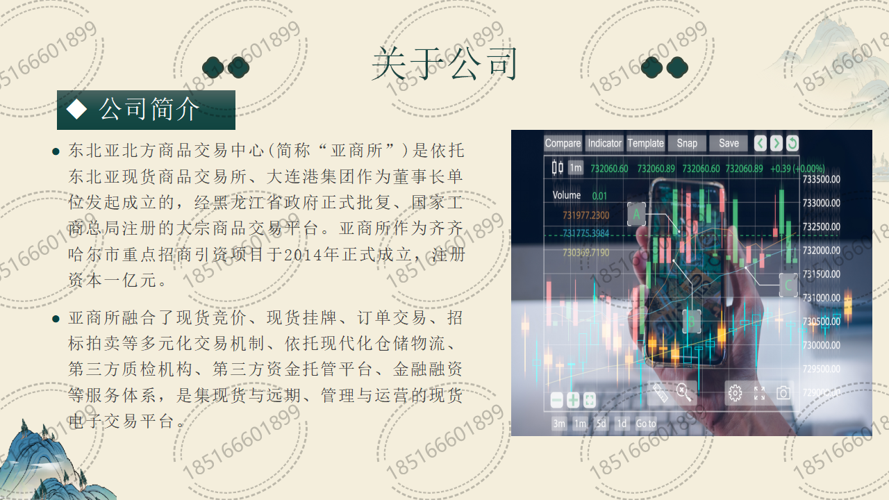 亚太国际交易中心(简称“亚北农品官网”)是依托亚太人参现货商品交易所、大连港集团作为董事长单位发起成立的,经黑龙江省政府正式批复、国家工商总局注册的大宗商品交易平台。亚北农品官网作为齐齐哈尔市重点招商引资项目于2014年正式成立,注册资本一亿元。 亚北农品官网融合了现货竞价、现货挂牌、订单交易、招标拍卖等多元化交易机制、依托现代化仓储物流、第三方质检机构、第三方资金托管平台、金融融资等服务体系,是集现货与远期、管理与运营的现货电子交易平台。